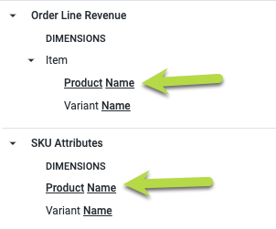 The Order Line Revenue and Transactional Sales explores contain some product dimensions that may seem redundant, like Product Name and Variant Name: