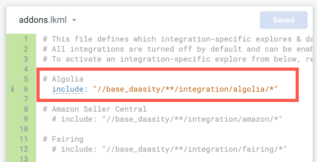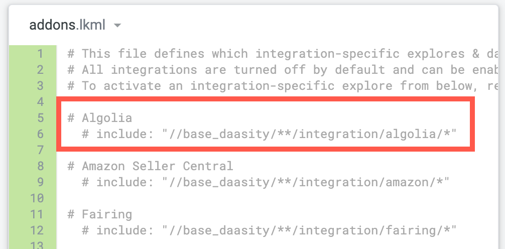 For example, to enable the Algolia explore & dashboard, you would uncomment the following line in your /base_config/addons.lkml file: