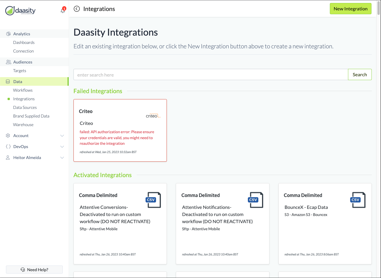 The integrations list page has been enhanced to highlight integrations that have errors/failures. The new section will always appear at the top as "Failed Integrations". That section will display the integration card with the appropriate error message on it.
