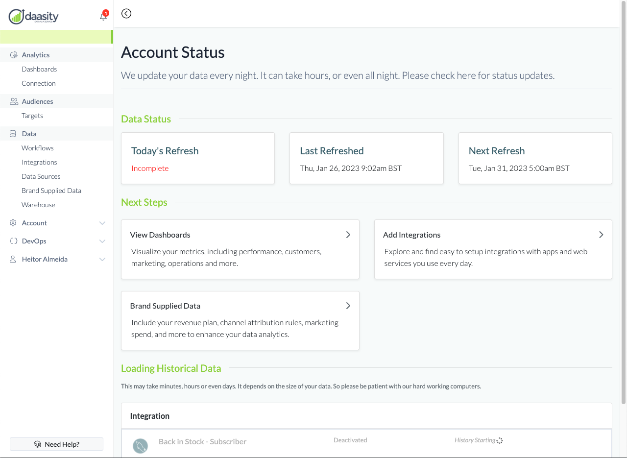 When an account has notifications enabled, a notification bell will appear in the left-nav section, just to the the right of the Daasity logo. If there are new notifications, a red badge on top of the bell will appear containing the count of unsolved notifications.