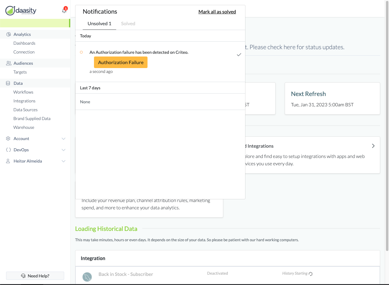When clicking on the bell, a list of notifications will be displayed. The example below shows an authorization failure that happened on a Criteo integration.