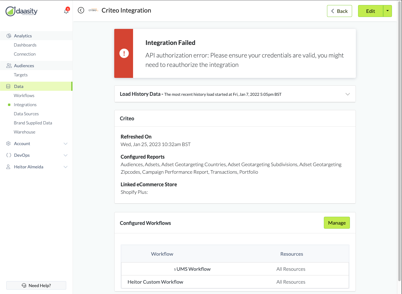 Clicking on the call to action button (e.g. Authorization Failure button) in the notification will take you to the integration show page. The integration page will display an appropriate message related to the failure.