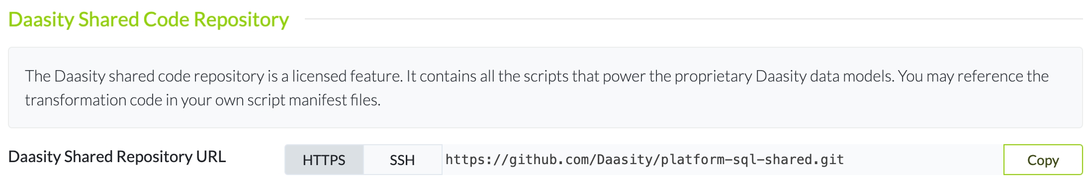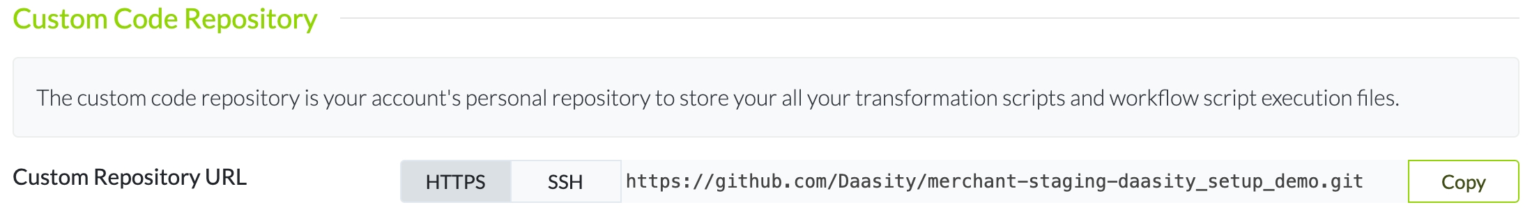 Once you get access to your code repository, you can use the URL listed in this section to access your company's custom code repository, where you can add your own SQL transformation script files and script manifest files.