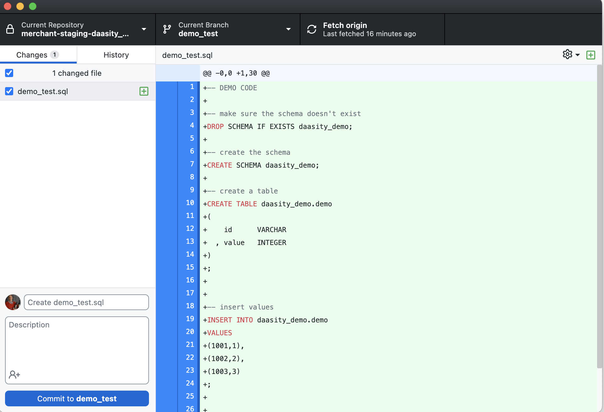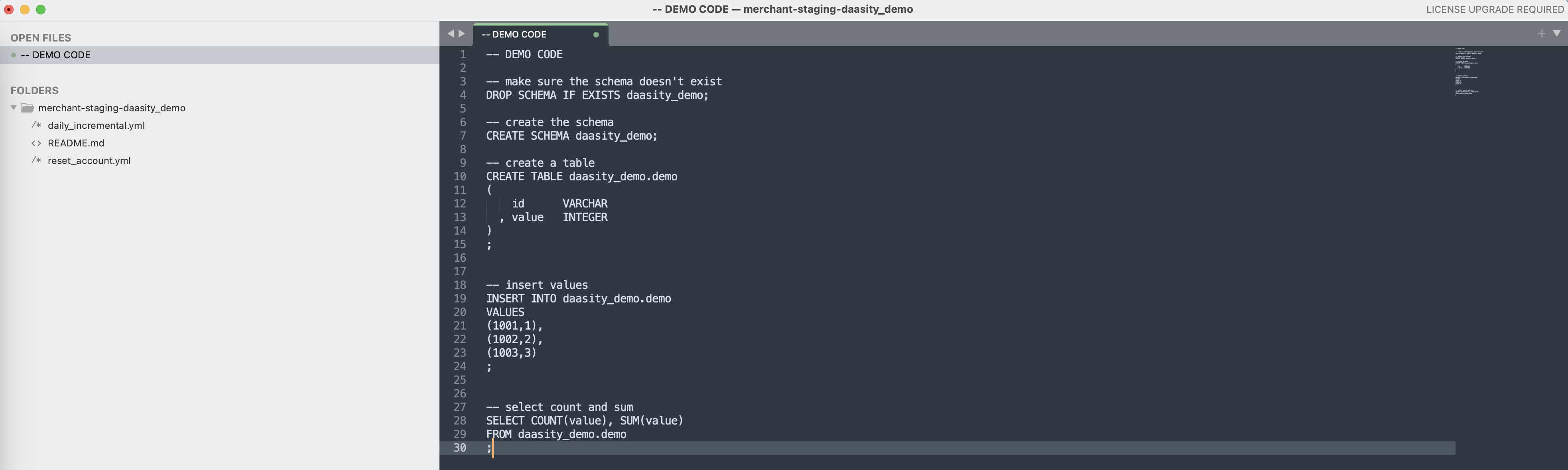 The Daasity platform will read your SQL code from the remote repository in Github and execute each statement that exists in the SQL file