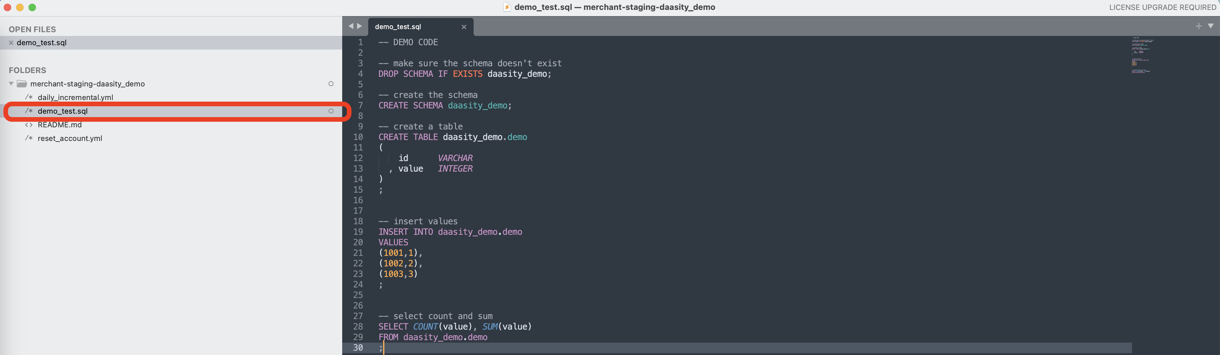 With a development branch created simply open your text editor to add your custom SQL.  You can use the SQL below \[`test_demo.sql`] to test out the custom SQL code functionality.