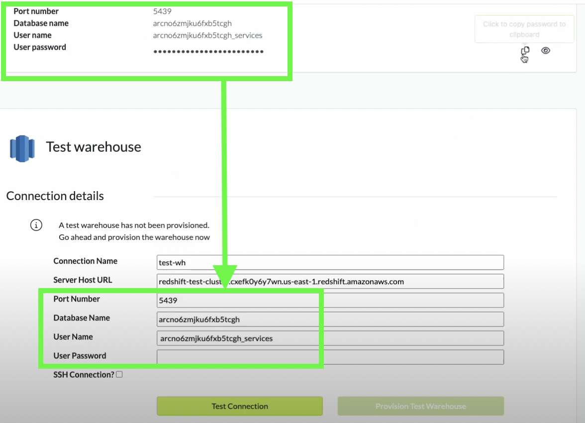 You can copy the Port Number, Database Name, User Name and User Password from your production warehouse as these will be the same