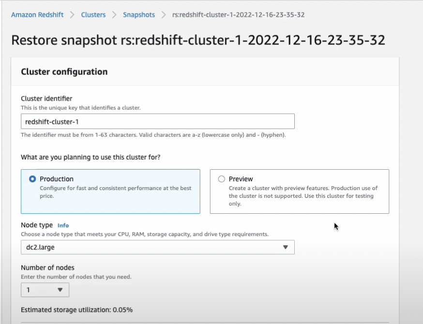 You should select the same Node type and Number of nodes as the original cluster that you are copying