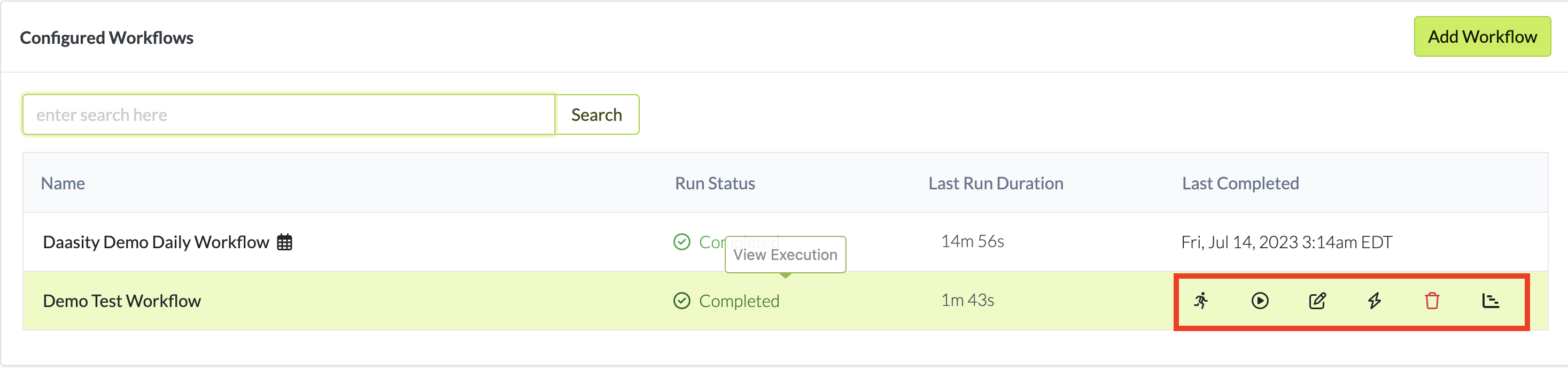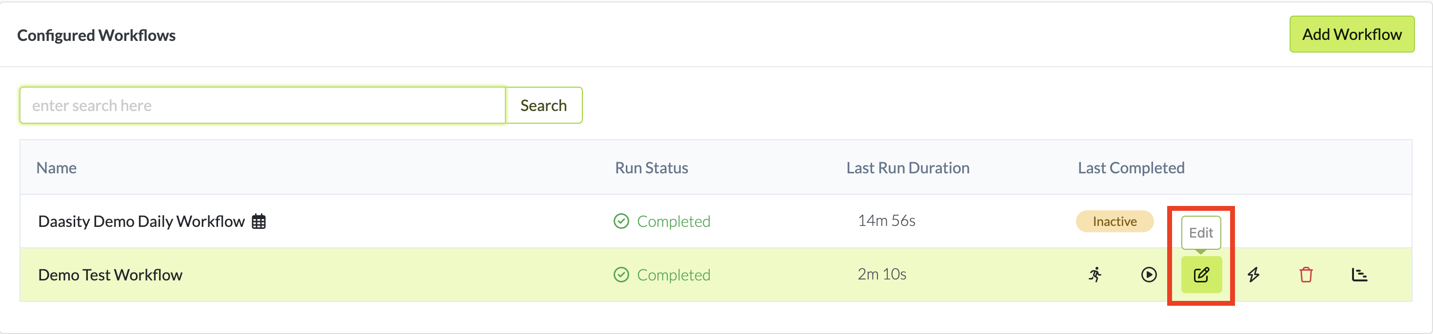 To edit a workflow just click on the edit workflow button next to the workflow you want to edit and make the changes similar to how you would in [Creating Workflows](https://help.daasity.com/technical-docs/workflows-and-scheduling/creating-workflows)