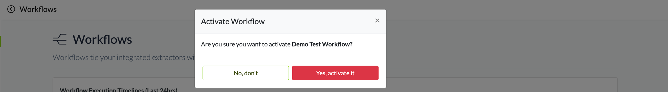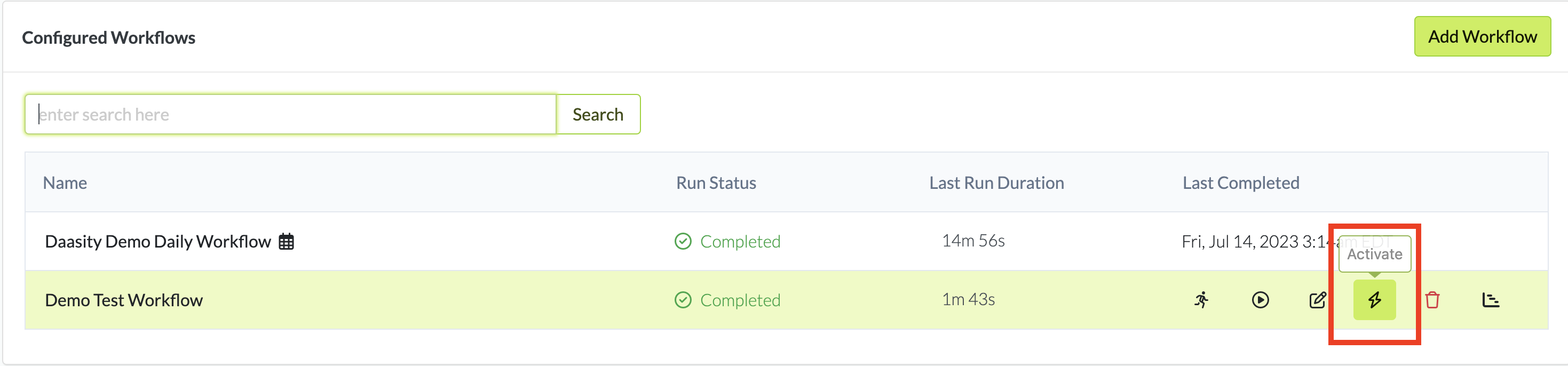 To activate a workflow click on the activate button next to the workflow you want to turn on: