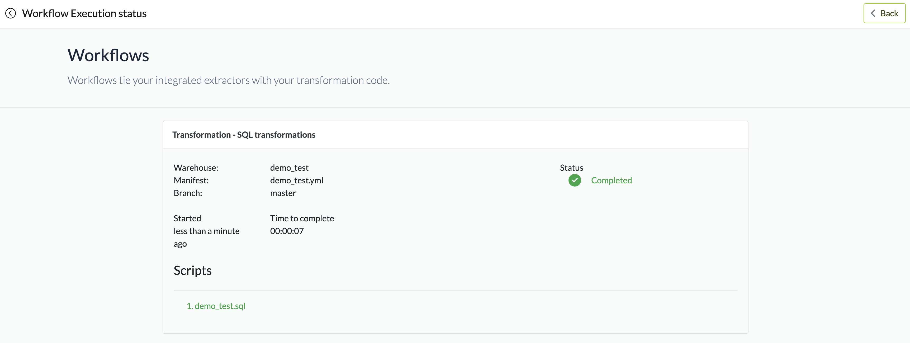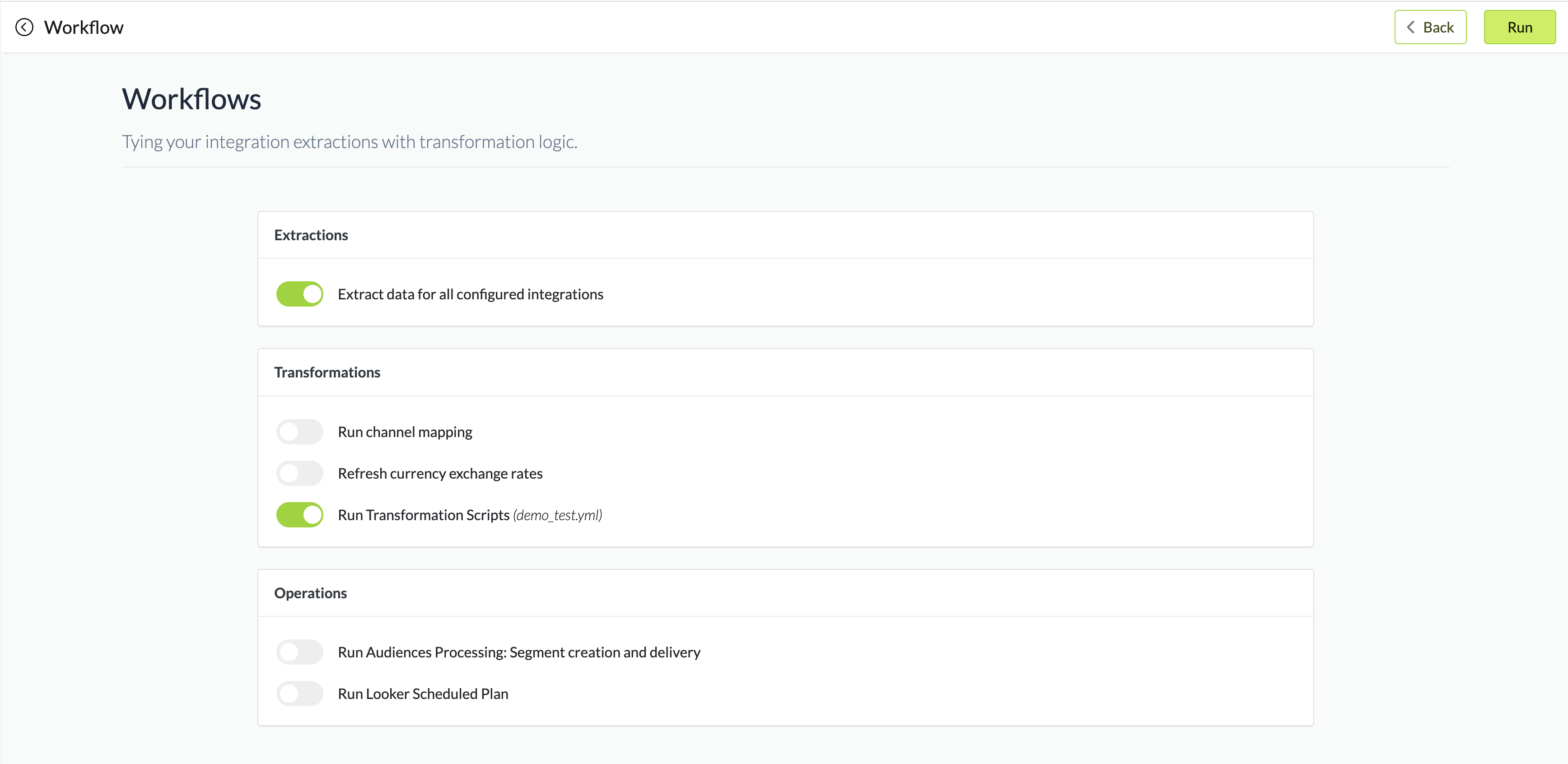 This will take you to the Workflows screen where you will select the Extractions, Transformations and Operations that you would like this one-time workflow execution to run