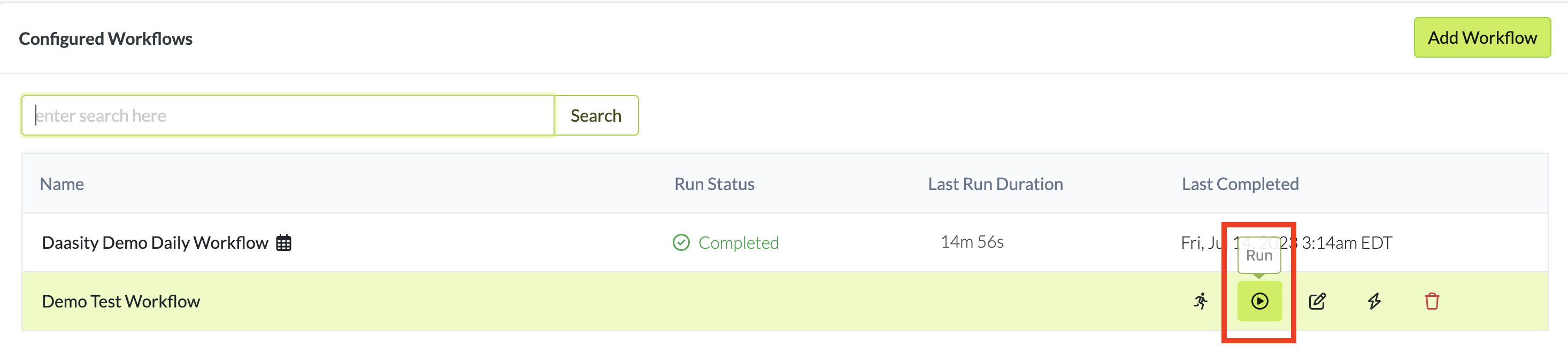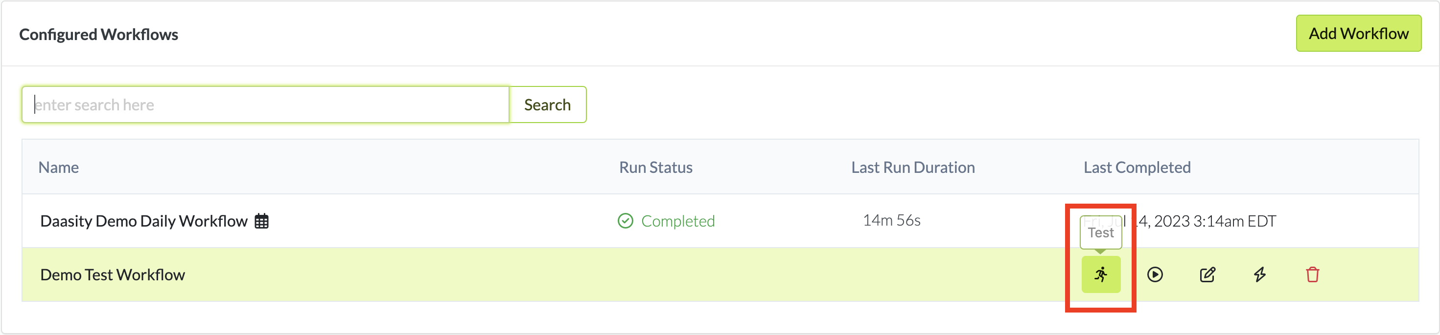 <img src="https://content.gitbook.com/content/amTMWiPne1v1V3L7mbuj/blobs/sC1SavSHOn1vIr6W2AU9/image.png" alt="" data-size="line"> [Test](#test-a-workflow) - Run the transformation portion of your workflow on a [test data warehouse](https://help.daasity.com/technical-docs/warehouse/test-data-warehouse/test-data-warehouse-overview).