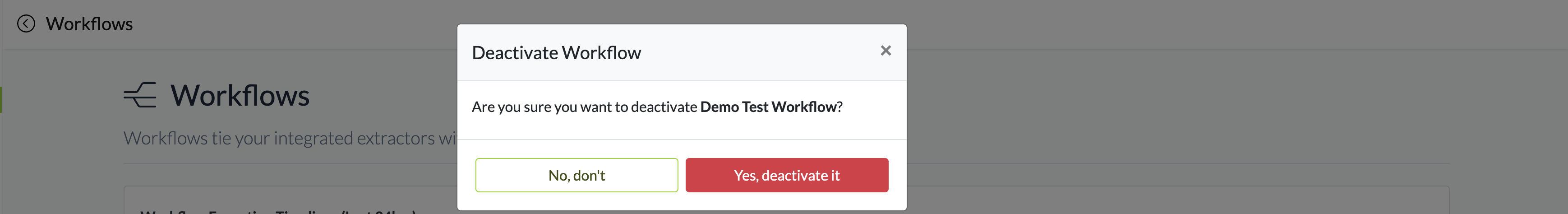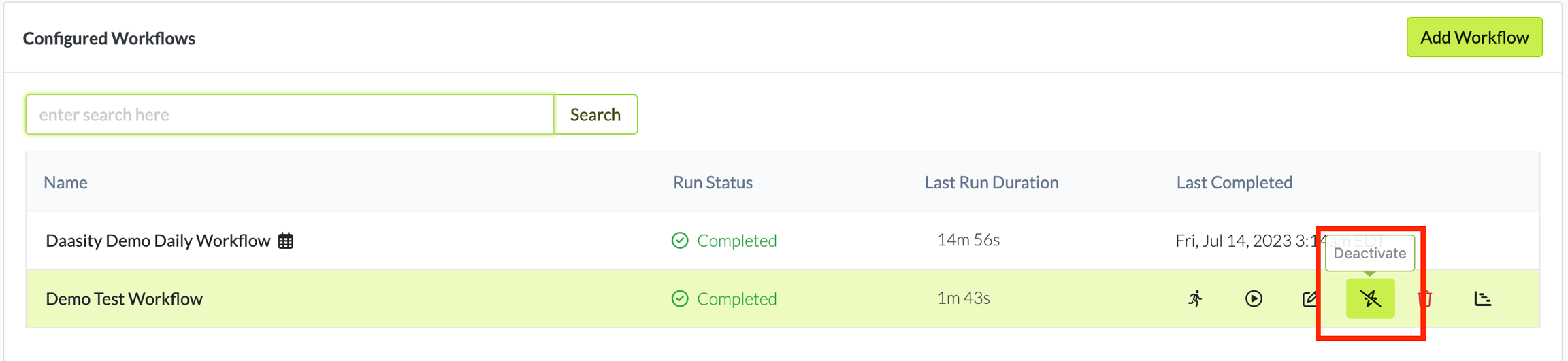 You can deactivate a workflow by clicking on the deactivate button next to the active workflow you want to turn off: