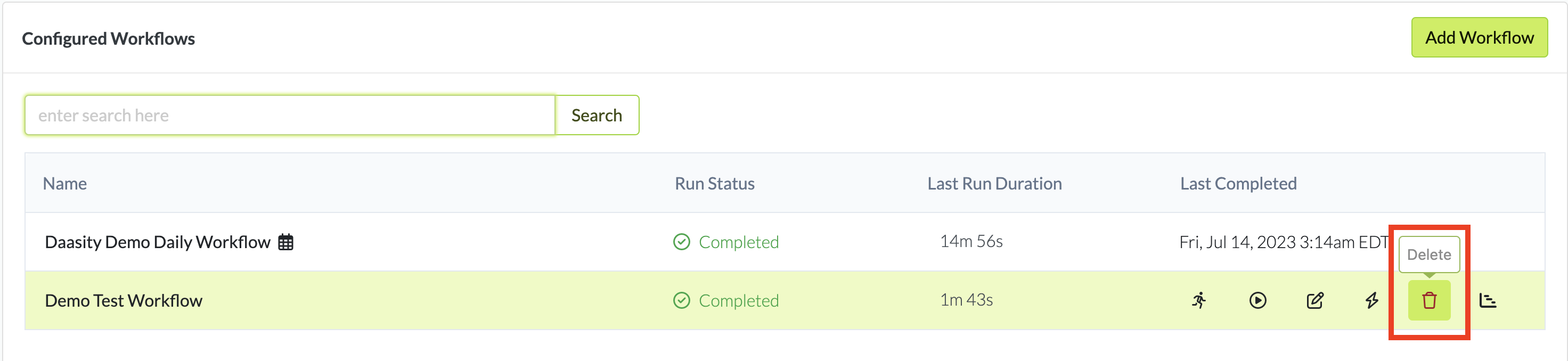 To delete a workflow click on the delete button next to the workflow you want to remove: