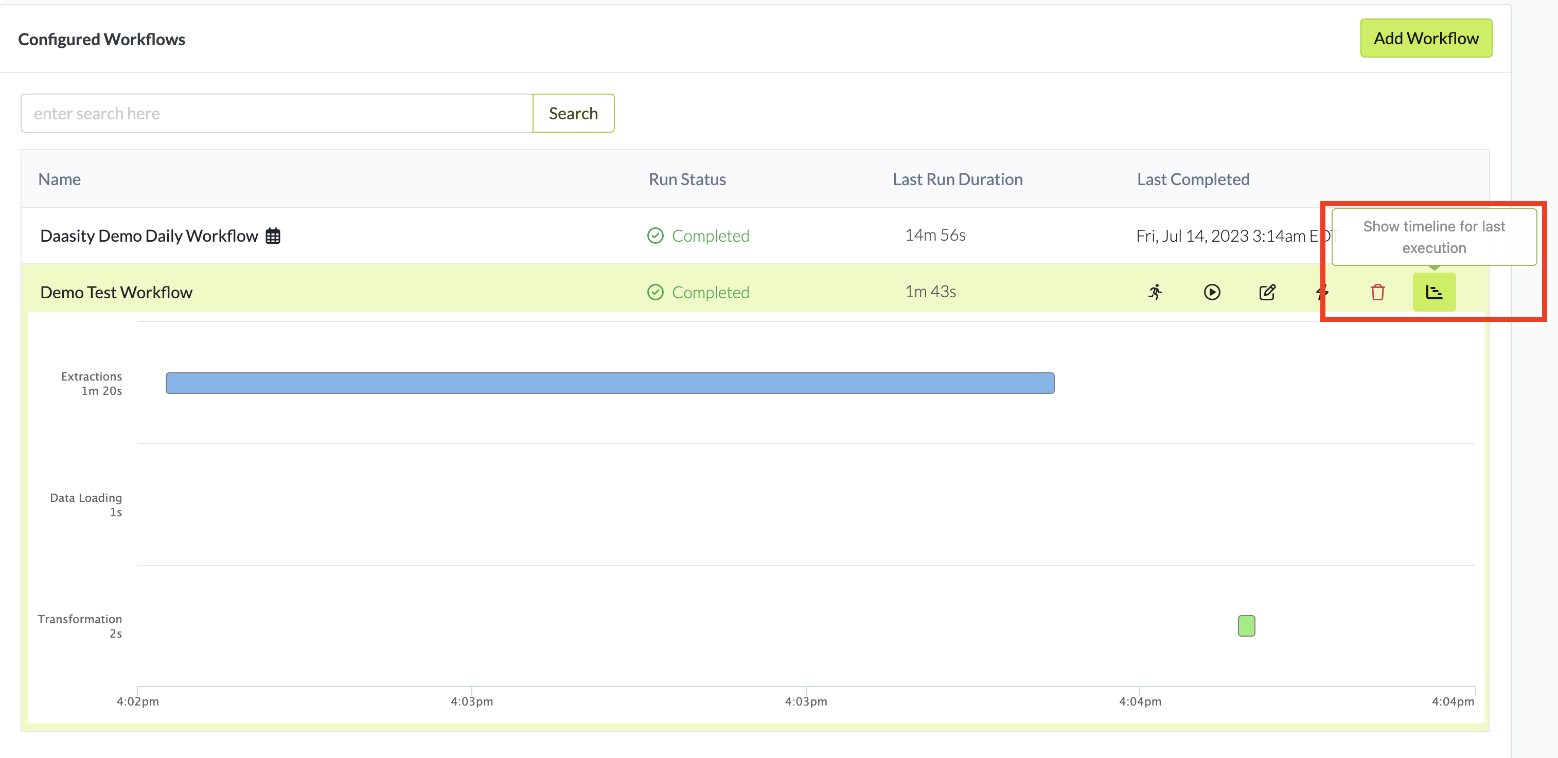 <img src="https://content.gitbook.com/content/amTMWiPne1v1V3L7mbuj/blobs/2UZxdkBeKsqOfUpZsM5F/image.png" alt="" data-size="line"> [Show Timeline](#showing-the-last-execution-timeline) - Show a graph of the time it took to extract, load, and transform the data the last time the workflow ran. This will only appear if the workflow has run at least once.