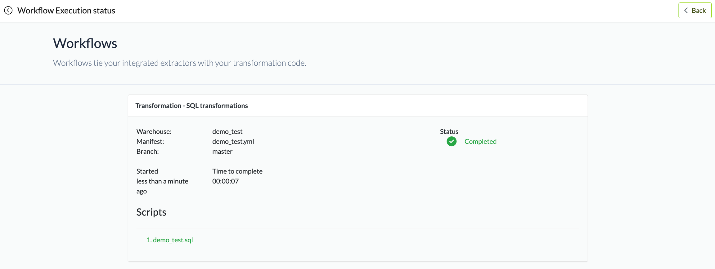 Run - Run the workflow on your production warehouse on-demand. You can choose to run the entire workflow or only specific parts.