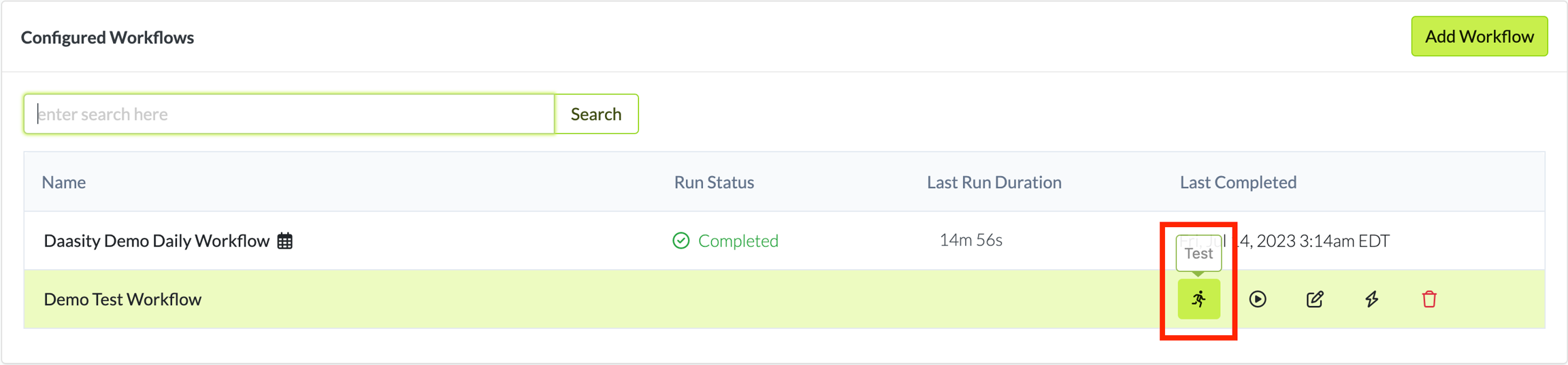 Testing a workflow enables you to run the transformation portion of your workflow on the Test Data Warehouse that you have created. This is good SQL code development practice as it will enable you to validate that the transformation code you have created generates the expected output before you put the transformation code into production