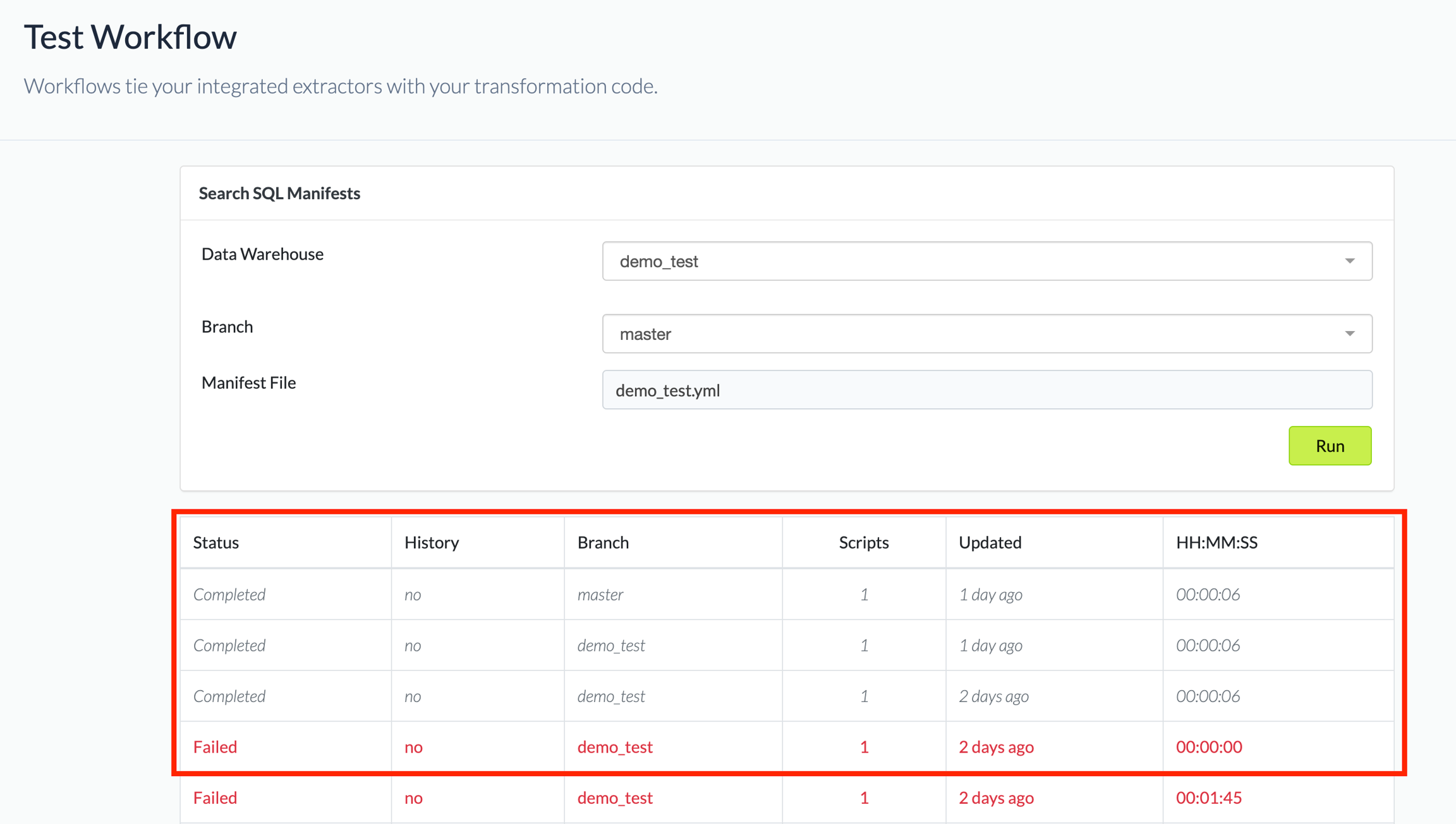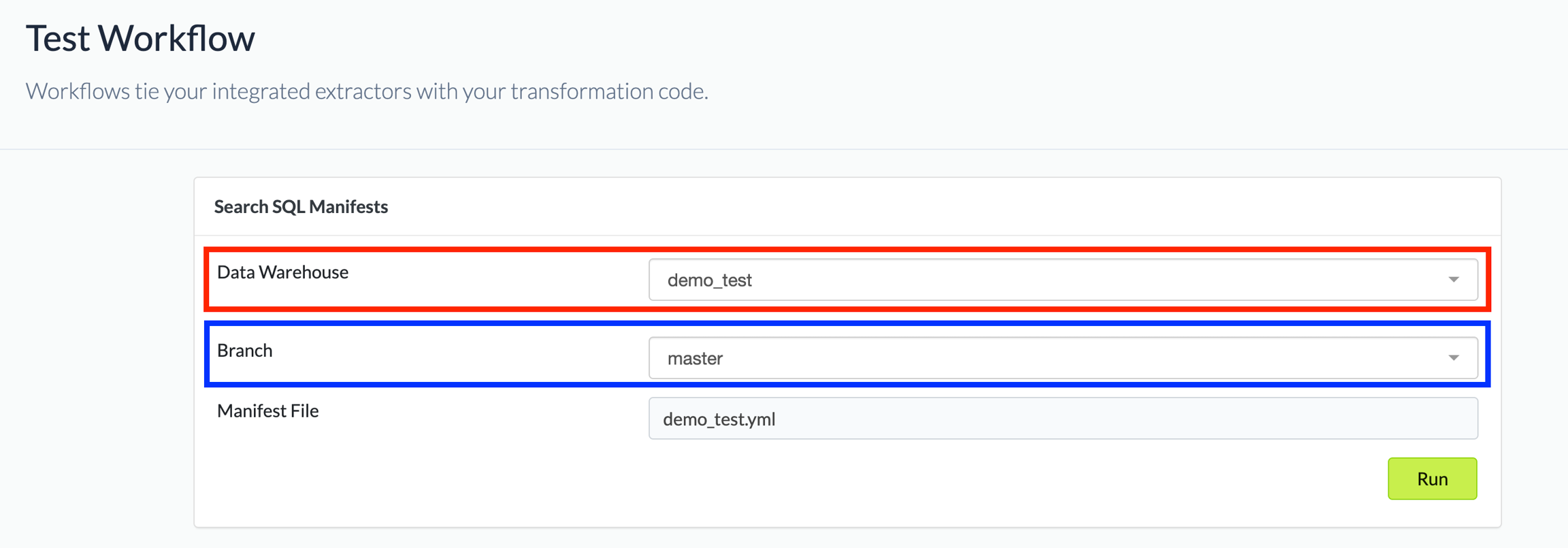 This will take you to the test workflow page where you will be able to select the test warehouse you want to run the code on and the branch of code you want to run by selecting the appropriate value from the two dropdowns.