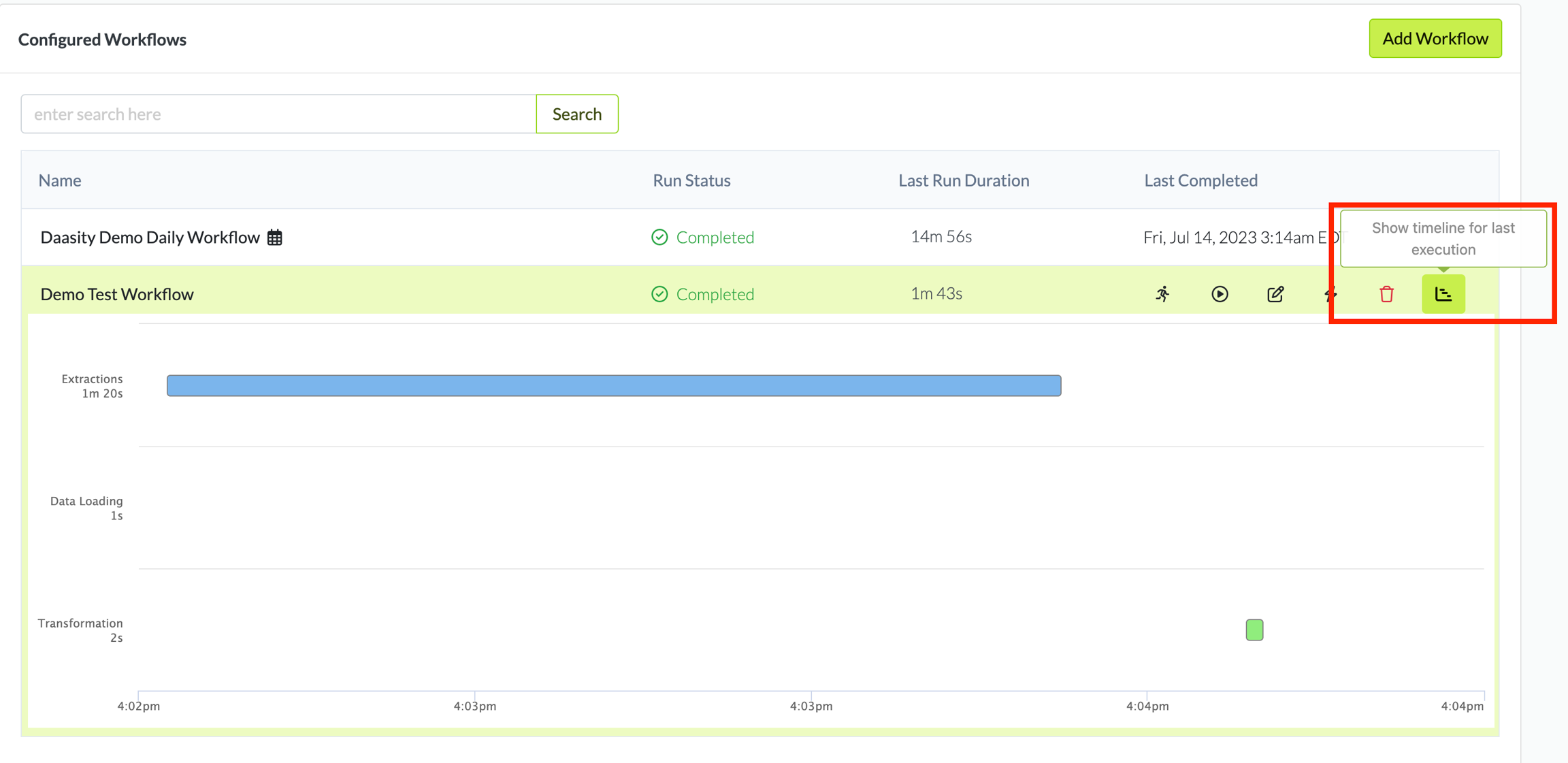 Showing the timeline for the last execution will expand the window to show you a graph of the time it took to extract, load and transform the data the last time the workflow ran. To view the graph click on the the show timeline button next to the workflow:
