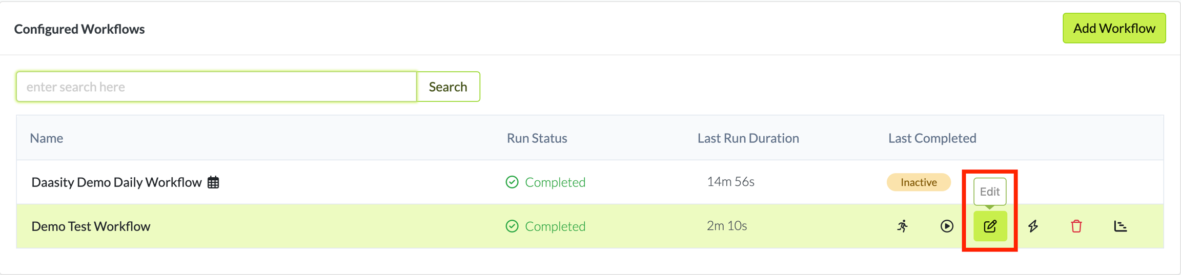 To edit a workflow just click on the edit workflow button next to the workflow you want to edit and make the changes similar to how you would in Creating Workflows