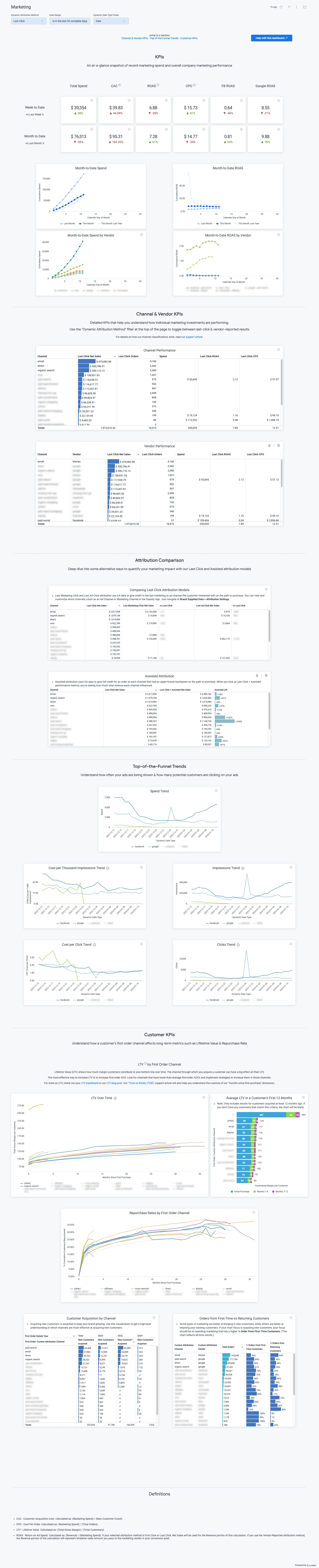 The KPIs, Channel & Vendor KPIs, and Attribution Comparison sections use the Marketing Attribution explore. This explore reflects data from your Google Analytics and marketing integrations.