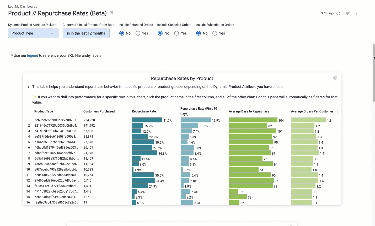 The Product Repurchase Rate (Beta) dashboard helps you understand repurchasing behavior across your product line.