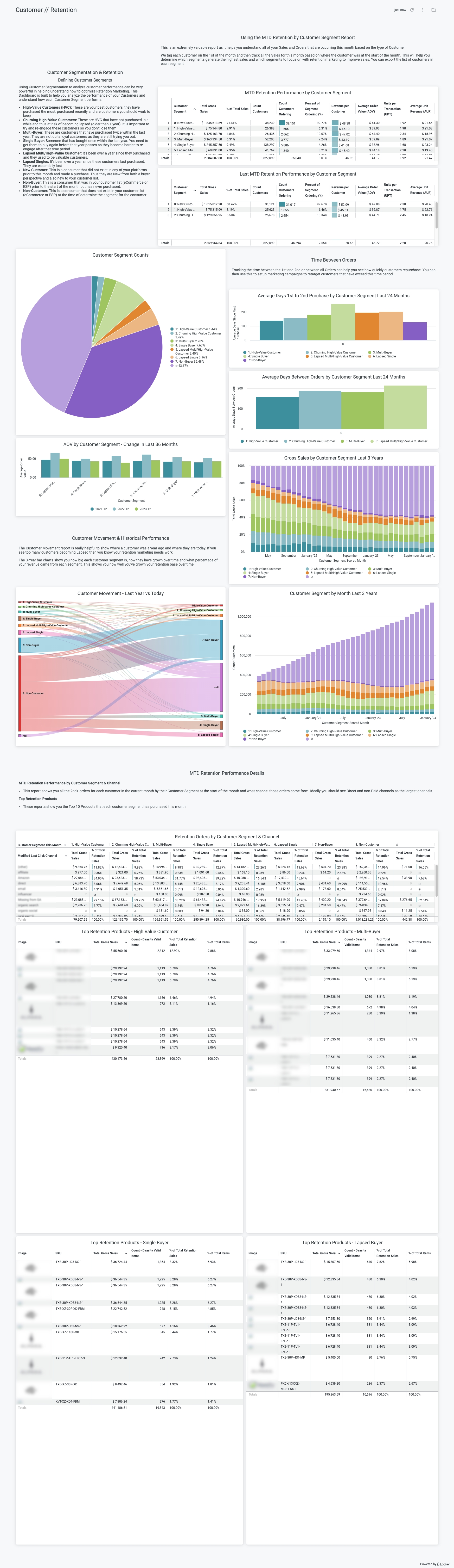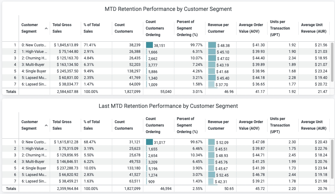 These two visualizations show current and last month to date performance (gross sales, orders, AOV, units per order, and average unit revenue) for each customer segment. For these visualizations, customers are tagged into a certain segment at the beginning of each month and they stay in that segment for the remainder of the month regardless of how many purchases they make. Note that this is NOT how the general customer segmentation works which is updated for every customer every day.