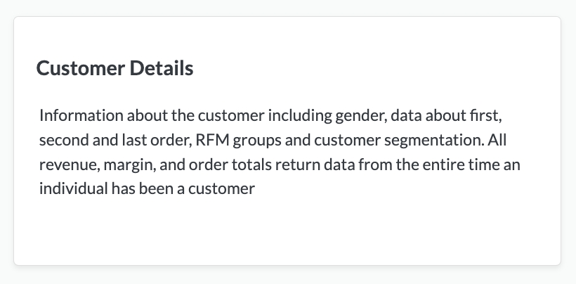Contains Customer data including, Gender, RFM Segmentation, and data on first and last order.