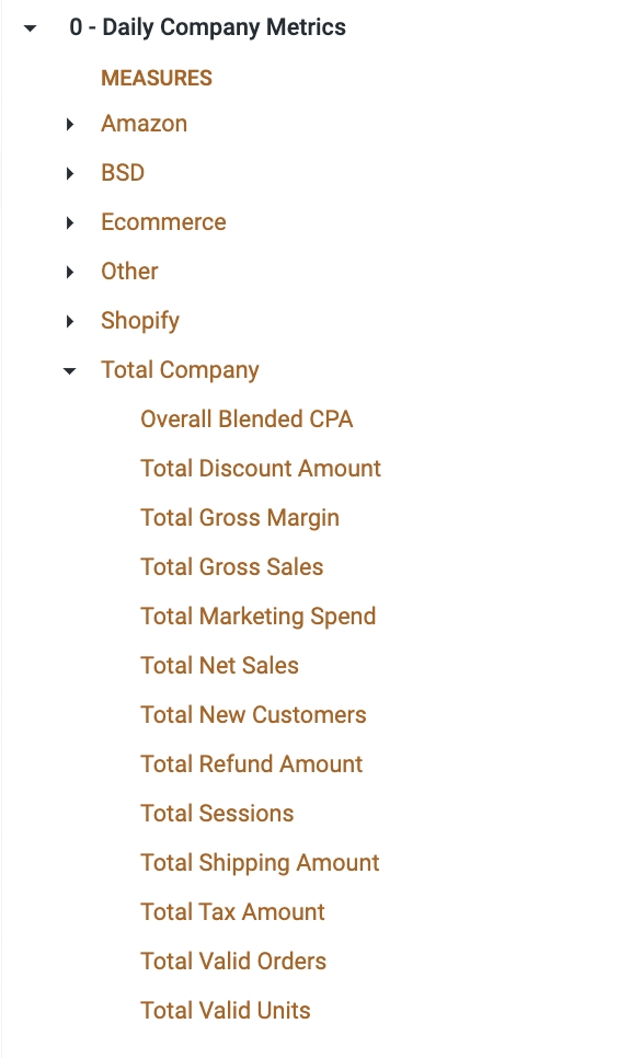 Contains Daily Company data, including sales, orders, new customers, and website sessions.