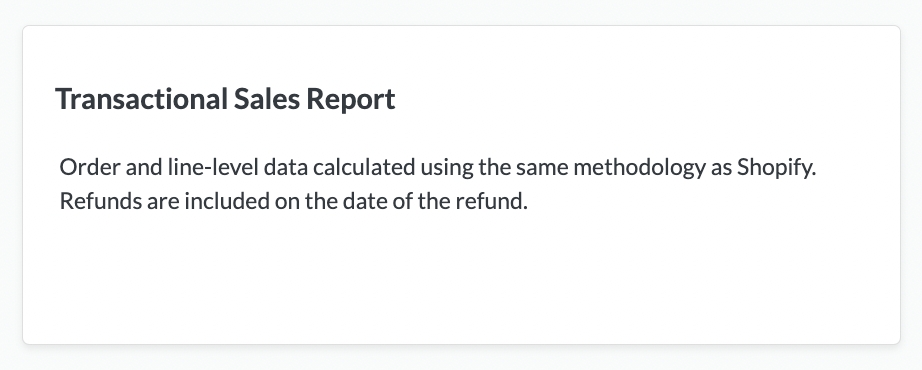 To compare data 1:1 in Daasity versus Shopify use the Transactional Sales Report Explore because it will match logic.