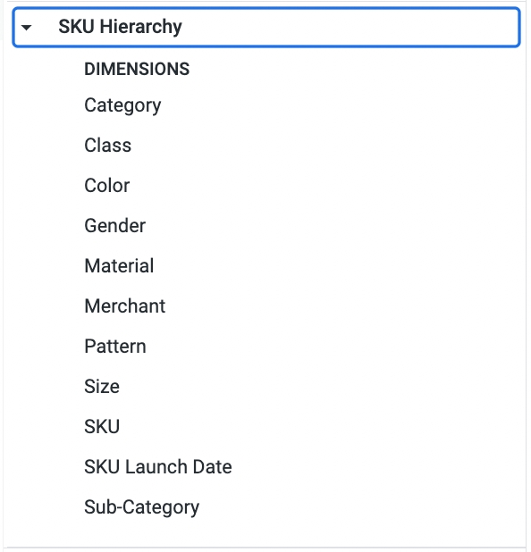You can use the SKU Hierarchy Dimensions from your SKU Hierarchy tab in your BSD Sheet.