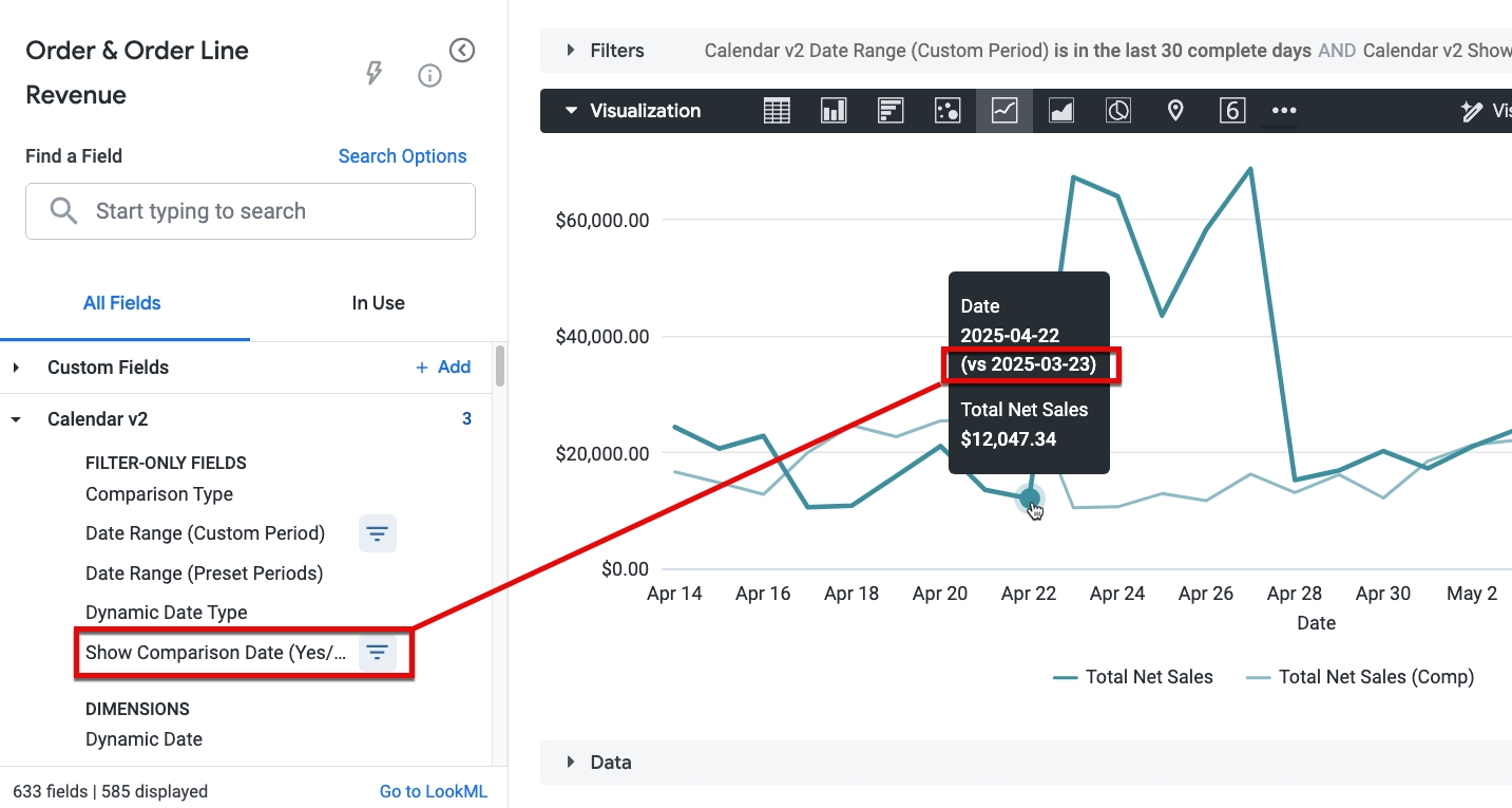 If you want to include both the current period date and the comparison period date in the tooltip of a chart, toggle on the Show Comparison Date (Yes/No) parameter. This lets you easily see which dates are being compared.